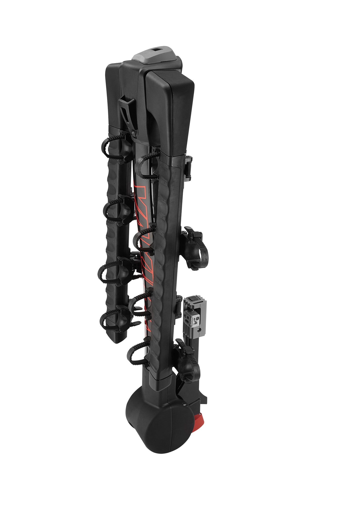 - UpperHand lever tilts rack down for vehicle access and folds it flat for easy storage