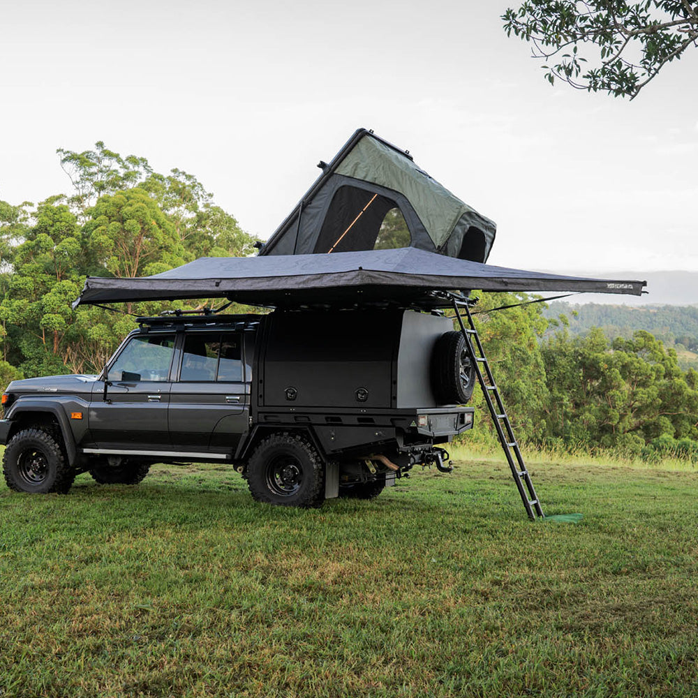 • Freestanding awning with heavy duty support arms make deployment effortless