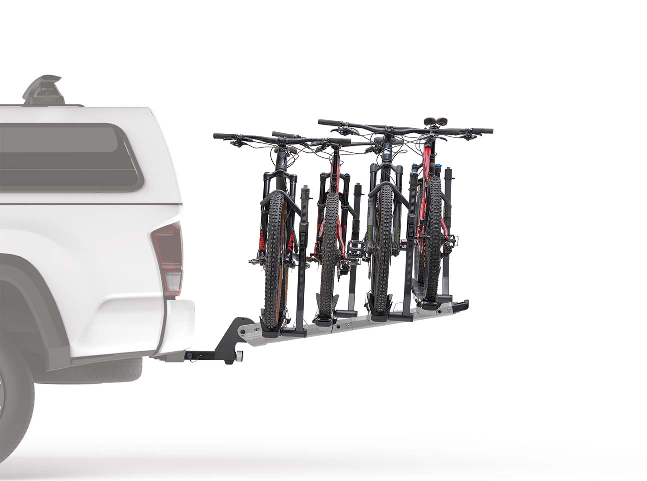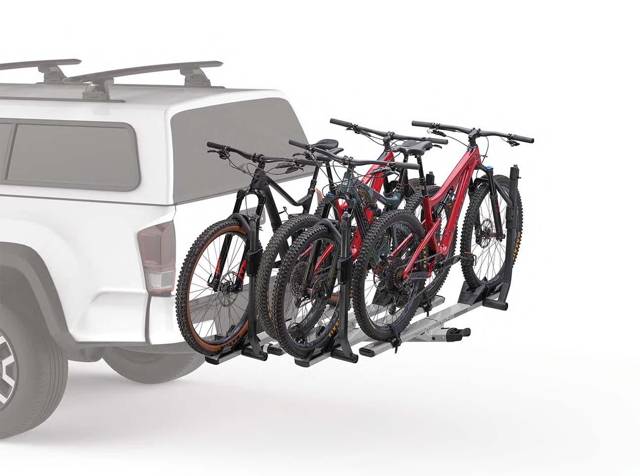 The stadium seating architecture increases ground clearance on rutted trails or steep driveways and its offset tray design further minimises bike to bike interference and maximises functionality. The forward-facing remote tilt lever means fast access to the rear area of your vehicle and integrated locking cables combine with your own lock to provide serious security.